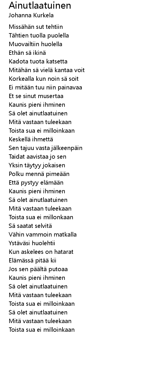 Johanna Kurkela Ainutlaatuinen / Ainutlaatuinen +lyrics / albumilta hyvästi, dolores haze (2010, © warner music finland), raita 4.