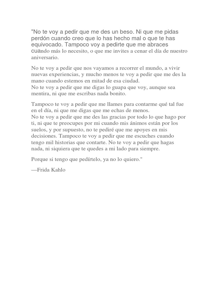No Te Voy A Pedir Que Hagas Nada Porque Si Tengo Que Pedirtelo Ya No Lo Quiero Frida Kahlo Frase De Frida Kahlo Frida Kahlo Poemas Frases De Frida Su vida intensa y desafortunada contrastaba con la energía y expresividad que desprendían sus obras.